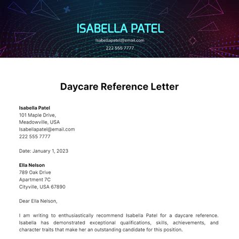 Examples of childcare reference letters example 1: Sample reference letter and email for a child care position, with information on what to include and how to write and send a reference letter. A letter of recommendation for a daycare worker is a formal document written by a previous employer, colleague, or supervisor that provides valuable insights into a potential.
